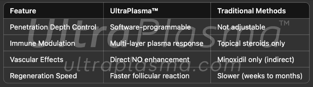 The UltraPlasma™ multi-platform plasma system represents a transformative advancement in the treatment of alopecia. By seamlessly integrating arc, argon, and helium plasma technologies, the device delivers a precisely modulated spectrum of energy and reactive gases that target the epidermis, dermis, and hypodermis in a layer-specific, synergistic manner. This dynamic interaction stimulates follicular regeneration, enhances vascular perfusion, balances immune responses, and promotes the release of key biomolecules such as nitric oxide and ozone. Unlike conventional therapies that often address symptoms superficially or through limited biochemical pathways, UltraPlasma™ offers a customizable, software-guided therapeutic strategy that addresses the complex pathophysiology of hair loss at its root. This innovation not only accelerates clinical outcomes but also opens new frontiers in non-invasive dermatological regeneration.