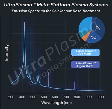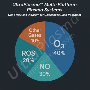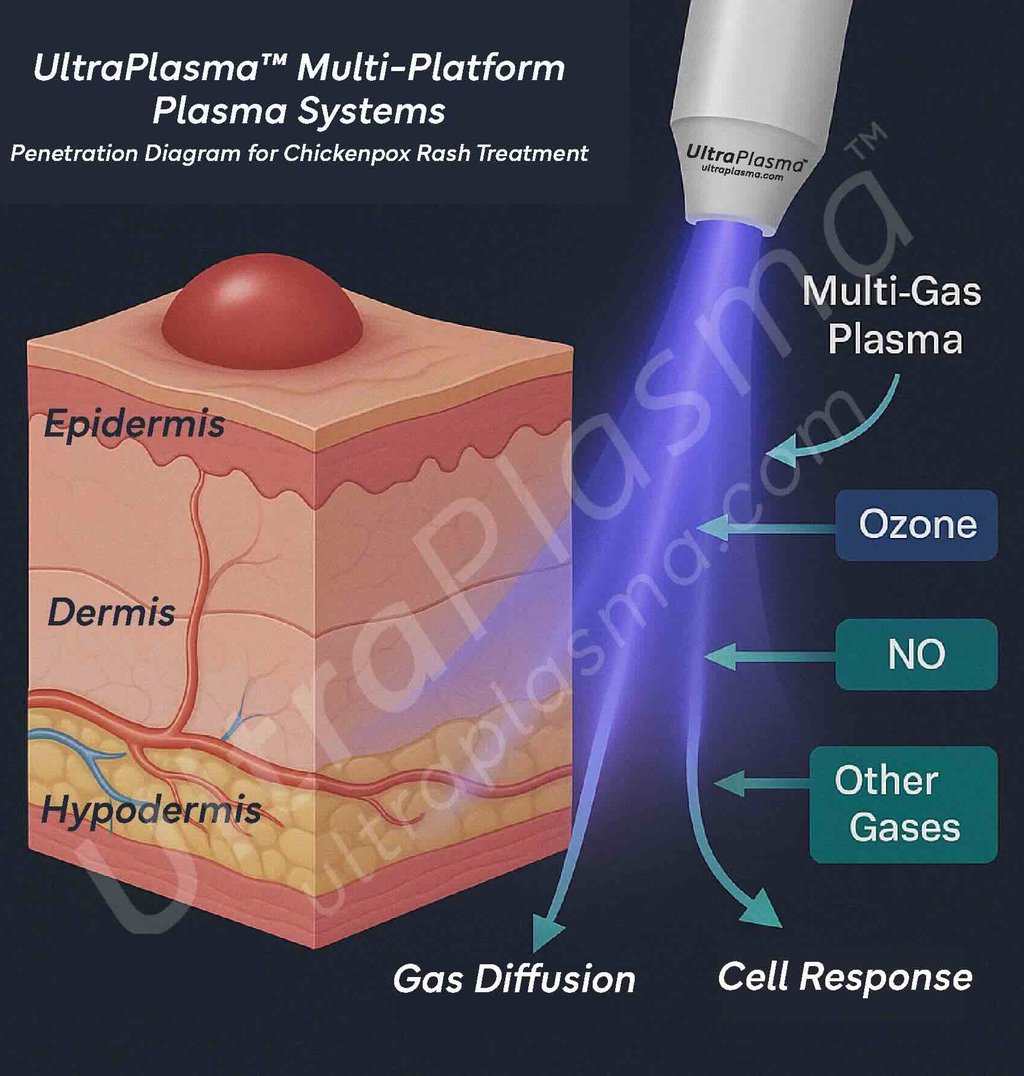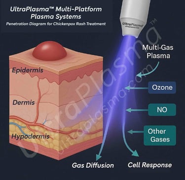 Chickenpox (varicella) is a viral infection characterized by itchy, blister-like rashes on the skin. Although it typically resolves within 7–10 days, the acute inflammation, vesicle rupture, and subsequent risk of scarring or secondary bacterial infections require supportive interventions. UltraPlasma™, a next-generation dermatological device, uses arc, argon, and helium plasma technologies with precisely tuned software and hardware-controlled emission spectrums, offering a non-invasive, sterilizing, and regenerative solution.