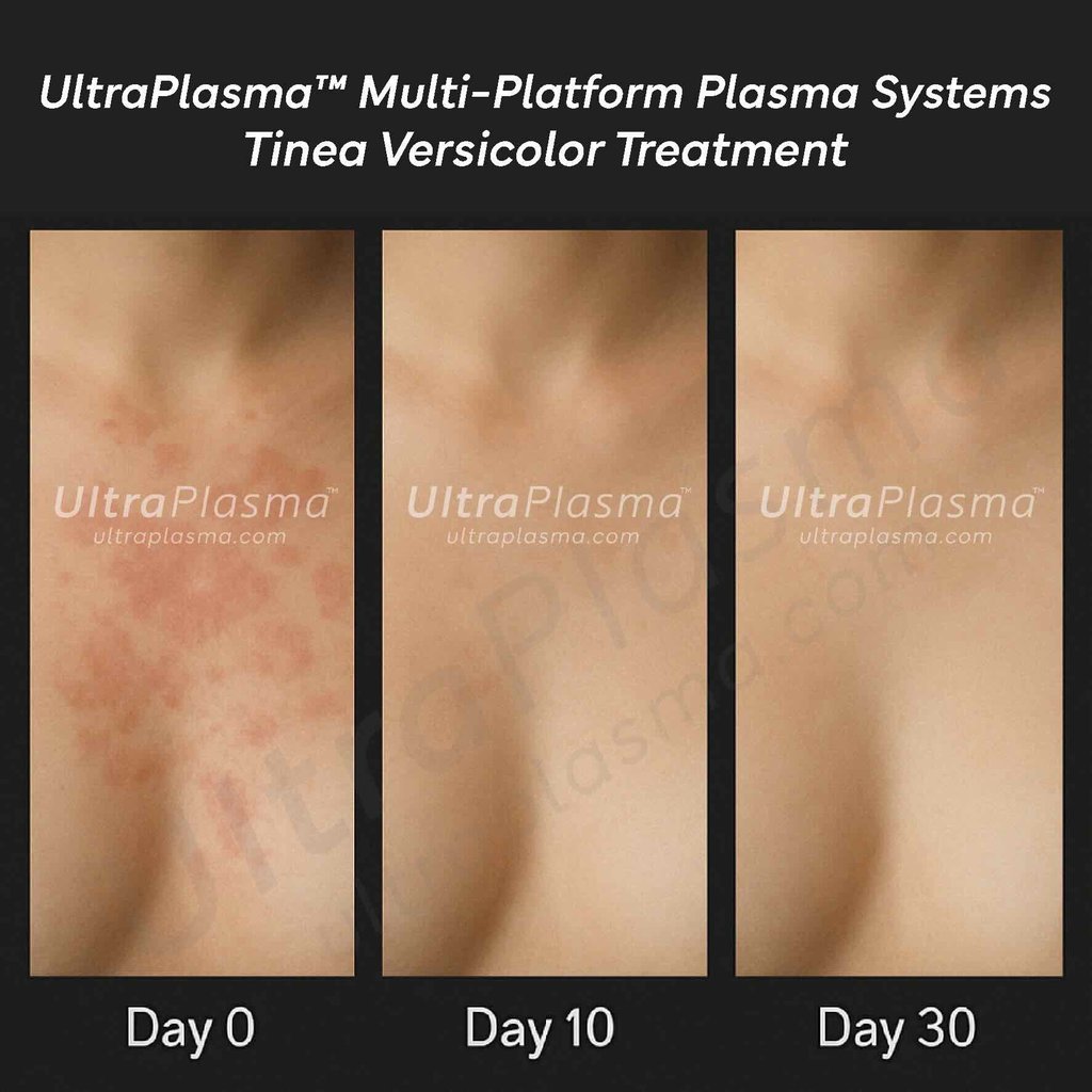 Tinea versicolor, also known as pityriasis versicolor, is a common superficial fungal infection caused by Malassezia species. Characterized by hypo- or hyperpigmented patches, it often affects the trunk, neck, and upper arms. Traditional antifungal treatments sometimes yield inconsistent outcomes due to fungal resistance or poor skin penetration. The UltraPlasma™ multi-platform plasma system introduces an innovative, non-invasive approach utilizing arc, argon, and helium plasmas, in combination with a smart spectrum-modulating software-hardware architecture, to treat Tinea versicolor efficiently.